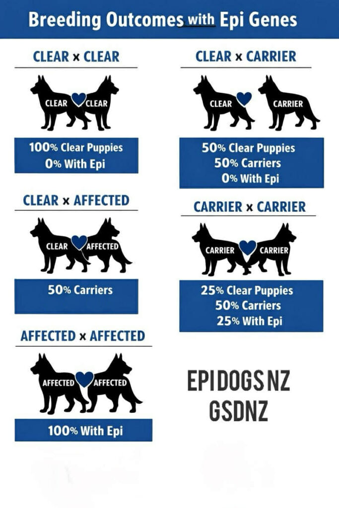 At this stage (2026) there is no health test that has been developed to identify carriers of EPI therefore if you have any litters with EPI affected puppies, you should not breed from the parent dogs again.